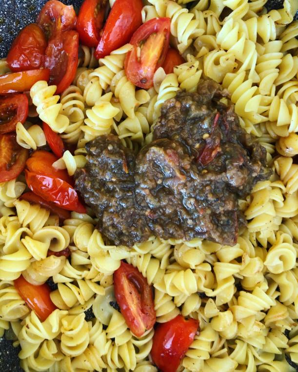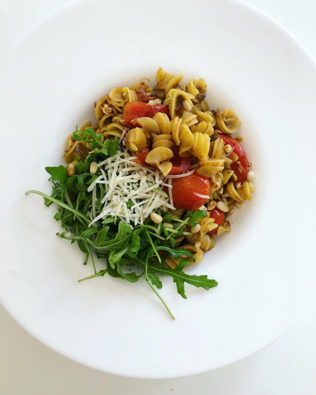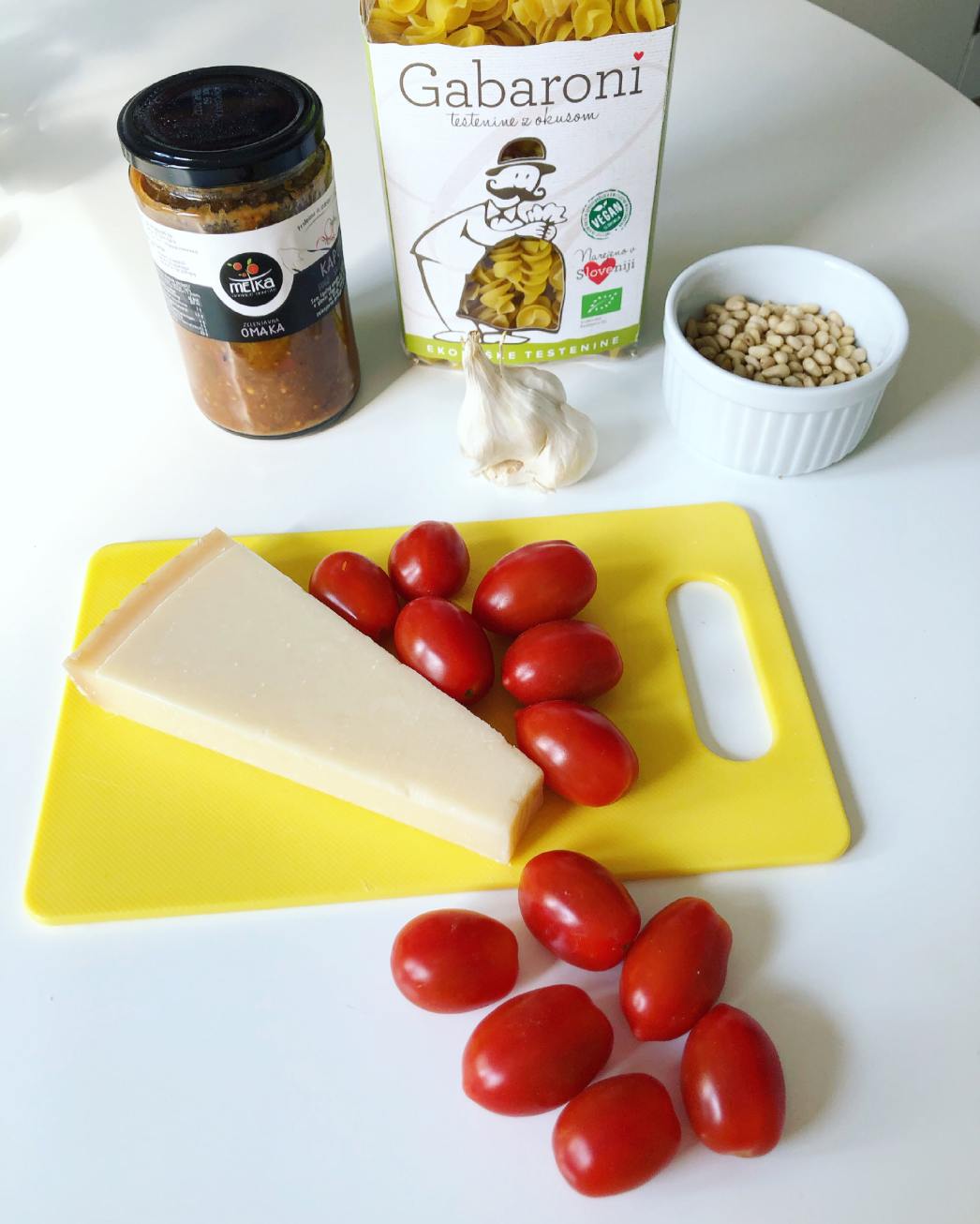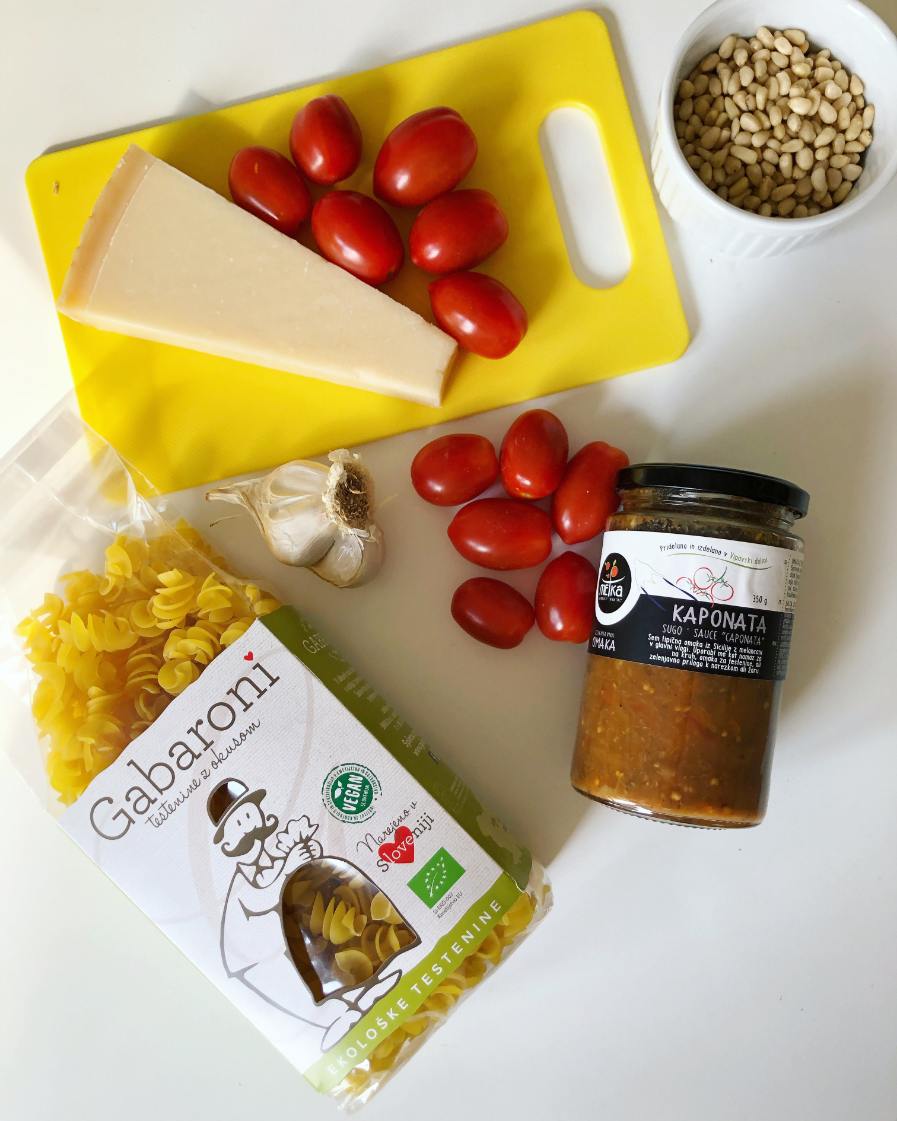 Medtem si pripravimo ostale sestavine. Naribamo parmezan in ga damo na stran. Narežemo česen in ga v ponvi skupaj s pinjolami prepražimo. Nato dodamo na pol prerezane paradižnike, solimo in na hitro popražimo na največjem ognju. Dodamo kuhane testenine, omako in nekajkrat vse skupaj premešamo.