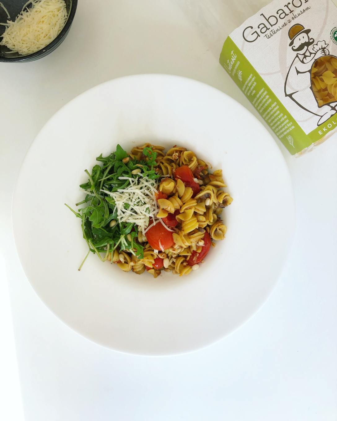 Potresemo s parmezanom, premešamo. Dodamo še nekaj kapljic olivnega olja.