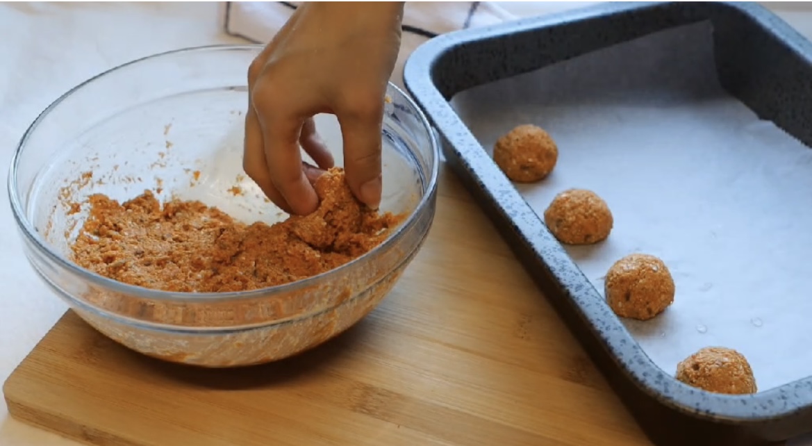 4. Nato oblikujemo manjše kroglice in jih polagamo na pekač, ki ga predhodno obložimo s papirjem za peko.